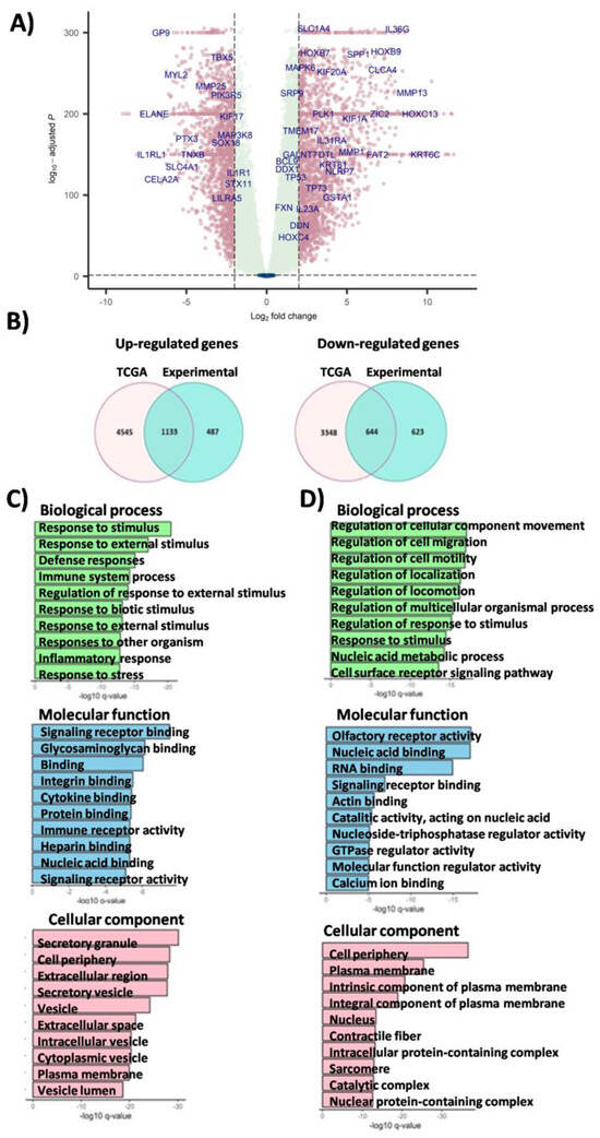 Results of the validation analysis obtained in the cohort of TCGA and GTEx samples. (A) Volcano plot displaying differentially expressed genes (DEGs) in the validation cohort of the SqCLC samples. Genes significantly differentially expressed in SqCLC compared to healthy controls are highlighted in pink. (B) Venn diagrams of commonly up- and downregulated genes in tested cohorts. (C,D) Gene Ontology analysis (GO) for up- (C) and downregulated (D) genes in categories of Biological Process, Molecular Function, and Cellular Component (validation cohort).