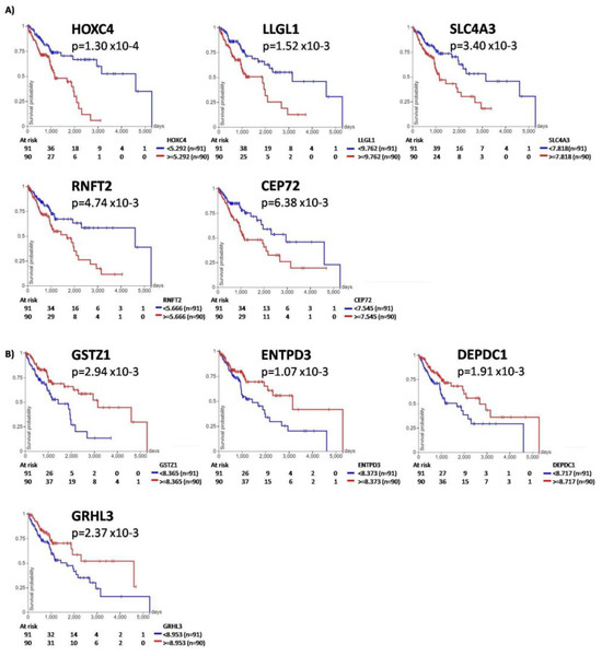 Kaplan–Meier survival curve analysis in early-stage TCGA-LUSC cohort. (A) Kaplan–Meier survival curve analyses for genes associated with the worst impact on patients’ overall survival (p < 0.01). (B) Kaplan–Meier curve analysis for the genes associated with a better impact on patients’ overall survival (p < 0.01). Patients were grouped by the median gene expression level. Red lines represent expression higher than the median, and blue lines represent gene expression lower than the median. P-value was calculated using a log-rank test; KM plots were generated using the Xena platform.