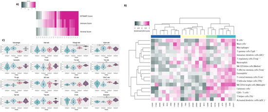 These analyses aimed to better define the tumor microenvironment in the context of the tumor-infiltrating immune cells. For an initial approximation of the level of tumor-infiltrated immune cells, we used the ESTIMATE algorithm (Estimation of Stromal and Immune cells in Malignant Tumors using Expression data) in the R estimate package. ESTIMATE is based on the single-sample gene-set enrichment analysis (ssGSEA) method that uses gene signatures related to stromal tissue and immune cells and outputs stromal score (SS), immune score (IS), and combined SS and IS as ESTIMATE score for each sample in analysis. To gain better insight into immune cell types that infiltrate the tumor, we performed an additional analysis, GSVA (Gene Set Variant Analysis), as described here [28], using 16 immune cell populations representing adaptive and innate immune systems. We included gene set signatures from Bindea et al. [29] for B cells, mast cells, macrophages, immature and activated dendritic cells, Neutrophils, NK dim, NK bright, T effector cells, T central memory cells, T helper, T follicular helper cells, and Cytotoxic cells. Gene sets representing cytotoxic cells included combined genes over-expressed in activated CD8+ T cells, T gamma delta cells, and NK cells. For CD8+ T cells, T gamma delta cells, and T regulatory cells, we used genes from Charoentong et al. [30]. A list of the genes used for GSVA enrichment can be found in Supplementary Table S2. Using GSVA scores of 16 immune cell populations and cytotoxic cells, coupled with hierarchical agglomerative clustering (Euclidian distance and Ward’s linkage), immune subtypes were identified. For both algorithms, rlog-transformed expression profiles were used as input. The immune cell infiltration analysis was not performed on the TCGA data because we did not have access to the FASTQ files of the selected samples, and, therefore, we found it inappropriate to directly compare identified subtypes in different sets of data.