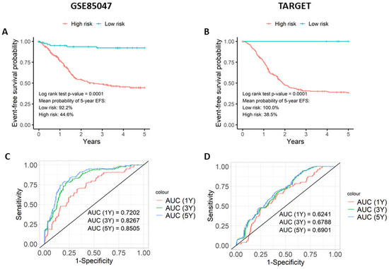 To determine if the prognostic model is predictive of EFS, the prognostic score was assessed using Kaplan–Meier and ROC curves on the validation datasets GSE85047 and TARGET (Figure 1). The Kaplan–Meier plots illustrate that patients with a higher prognostic score had lower EFS outcomes than those with lower prognostic scores (Figure 1A,B). This observation was statistically significant on both the GSE85047 and TARGET datasets (p < 0.0001 in both). In GSE85047 (Figure 1A), high-risk patients had a 44.6% probability of 5-year EFS with a mean survival time of 2.95 years, whereas low-risk patients had a 92.2% probability of 5-year EFS with a mean survival time of 4.68 years. Similar results were obtained with TARGET (Figure 1B). High-risk patients had 38.5% probability of 5-year EFS with a mean survival time of 3.73 years, whereas low-risk patients had 100.0% probability of 5-year EFS. Median survival times could not be computed in the two validation datasets as fewer than 50% of patients experienced an event in the two sets of risk groups.