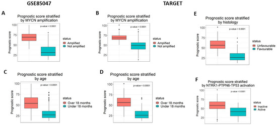 The prognostic score is significantly associated with prognostic markers. The prognostic score was measured for its association with four prognostic markers as follows: (A,B) MYCN amplification (C,D) diagnosis under the age of 18 months, (E) tumour histology, and (F) NTRK1-PTPN6-TP53 activation. The association was statistically significant for all results, using the Mann–Whitney test. GSE85047 is missing the data required to measure the association for tumour histology and NTRK1-PTPN6-TP53 activation.