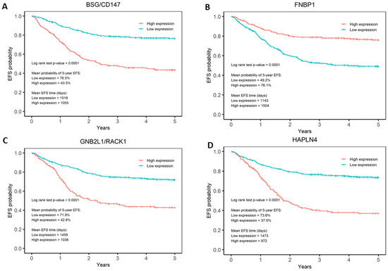 Kaplan–Meier analyses of BSG/CD147, FNBP1, GNB2L1/RACK1, and HAPLN4 genes. Kaplan–Meier analysis showed that (A) BSG/CD147, (B) FNBP1, (C) GNB2L1/RACK1, and (D) HAPLN4 are the genes in the signature that show the best differentiation between low- and high-risk patients. For BSG/CD147, GNB2L1, and HAPLN4, low expression is associated with favourable EFS. Conversely, for FNBP1, high expression is associated with favourable EFS.