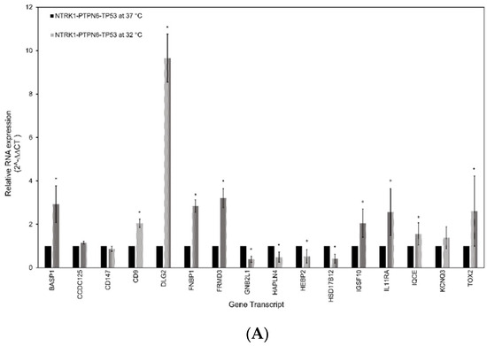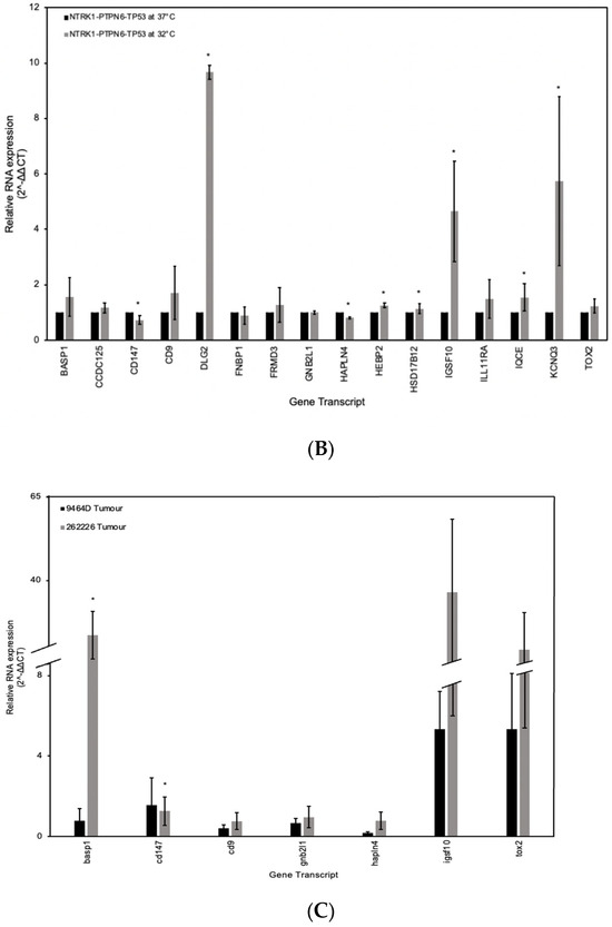 The gene signature was validated using RT-qPCR. RNA extracted from SH-SY5Y and SK-N-AS cells grown at 32 °C and with an activated NTRK1-PTPN6-TP53 module was compared to RNA extracted from NTRK1-PTPN6-TP53 cells grown at 37 °C and without the activated module. As controls, RNA from SH-SY5Y and SK-N-AS non-transfected and tsp53 transfected cells grown at 32 °C or 37 °C were used. The relative mRNA abundance of each gene was obtained by the 2−∆∆CT method, normalised against controls β-actin and HPRT mRNA. SH-SY5Y cells with an activated NTRK1-PTPN6-TP53 module demonstrated a statistically significantly greater abundance of mRNA transcripts corresponding to genes BASP1, CD9, DLG2, FNBP1, FRMD3, IGSF10, IL11RA, IQCE, and TOX2 (p = < 0.05) (Figure 4A). Additionally, mRNA transcripts corresponding to genes GNB2L1/RACK1, HAPLN4, HEBP2 and HSD17B12 had a significantly lower abundance in cells with an active NTRK1-PTPN6-TP53 module, compared to cells lacking the activated module (p = < 0.05). CCDC125, BSG/CD147 and KCNQ3 did not reach statistical significance. However, CCDC125 and KCNQ3 mRNA abundance was greater in cells with activated NTRK1-PTPN6-TP53 (2−∆∆CT 1.154, p = 0.17, 2−∆∆CT 1.379, p = 0.282, respectively), whilst BSG/CD147 mRNA abundance was lower in cells with an activated NTRK1-PTPN6-TP53 module (2−∆∆CT 0.872, p = 0.075), ultimately following the expected trend. Similar results were observed with SK-N-AS cells. Cells with an activated NTRK1-PTPN6-TP53 module demonstrated a statistically significantly greater abundance of mRNA transcripts corresponding to genes: DLG2, IGSF10, IQCE and KCNQ3 (p = < 0.05) (Figure 4B). Although BASP1, CD9, FRMD3, IL11RA and TOX2 did not reach statistical significance, their mRNA abundance was greater in cells with an activated NTRK1-PTPN6-TP53 (2−∆∆CT 1.563, p = 0.667, 2−∆∆CT 1.710, p = 0.540, 2−∆∆CT 1.279, p = 0.781, 2−∆∆CT 1.488, p = 0.397 and 2−∆∆CT 1.232, p = 0.140) (Figure 4B). CD147 and HAPLN4 showed a statistically significantly lower mRNA abundance (p = < 0.05). For CCDC15 and FNBP1, the expectation was an increase in expression, and for GNB2L1, HEBP2 and HSD17B12 was a decrease in mRNA abundance. SH-SY5Y and SK-N-AS cells express wt-TP53 and the β isoform of TP53, respectively. Although both cell lines do not express endogenous NTRK1 and amplified MYCN [46,47,51,52], we cannot exclude the possibility that the differences in the transcriptional background of these cells could impact on the expression of these genes.