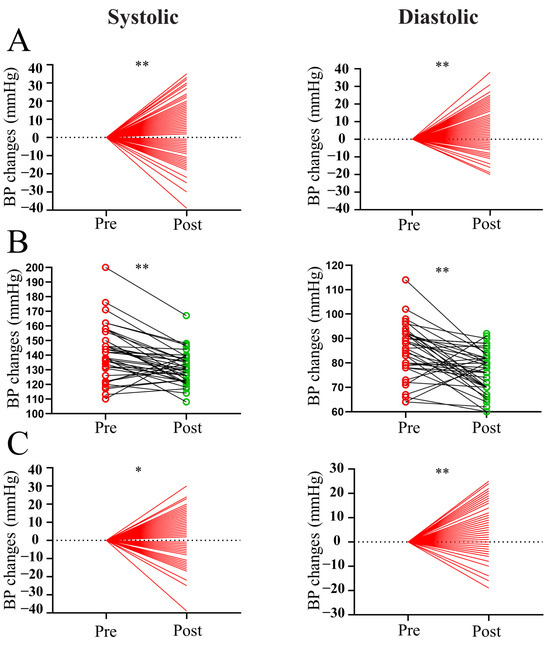 Pre- and postoperative BP changes in patients with prolactinoma. (A) Pre- and postoperative measurements of systolic and diastolic BP in all patients with prolactinoma. (B) Pre- and postoperative measurements of systolic and diastolic BP in hypertensive patients with prolactinoma. (C) Pre- and postoperative measurements of systolic and diastolic BP in nonhypertensive patients with prolactinoma. ** p < 0.01 vs. preoperative group; * p < 0.05 vs. preoperative group. Red indicates pre-operation and green indicates post-operation.