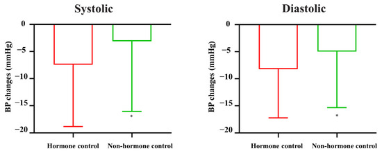 BP changes in patients with or without hormone control. * p < 0.05 vs. hormone control group.