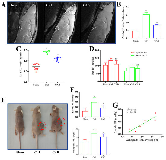 A total of 24 female rats were randomly divided into three groups: (i) sham (n = 8), (ii) control (Ctrl) (prolactinoma, n = 8), and (iii) CAB (prolactinoma + CAB, n = 8). To establish the in situ rat prolactinoma model, 1 cm silastic capsules containing 10 mg of 17-β estradiol (MedChemExpress, Shanghai, China, cat. E2758) were implanted into 4-week-old rats subcutaneously, as described in our previous reports [12,13]. Five weeks later, an MRI was performed to validate the establishment of prolactinoma. At this point, the CAB (0.5 mg/kg, MedChemExpress, Shanghai, China) or control (Ctrl) 0.9%, saline (100 μL) was injected twice a week by gavage. Four weeks later, an MRI examination was conducted to measure tumor size, and the BP was subsequently measured.
