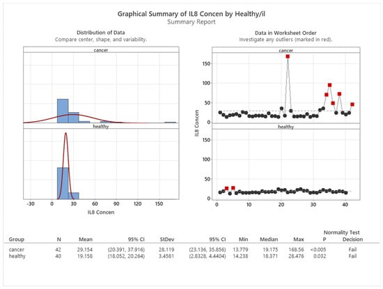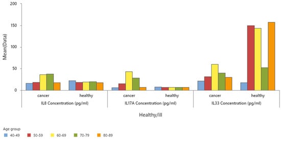 | IL8 Concentration (pg/mL) | 40–49 | 3 | 0 | 15.85 | 1.26 | 2.19 | 13.78 | 13.78 | 15.62 | 18.14 | 18.14 |