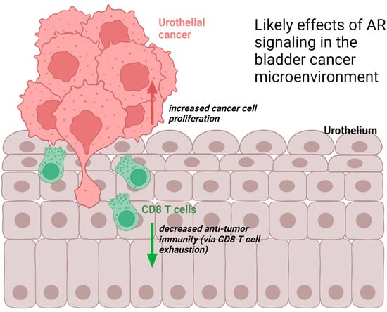 Likely effects of androgen receptor signaling in the bladder cancer microenvironment. Figure created with biorender.com, accessed on 14 December 2023.