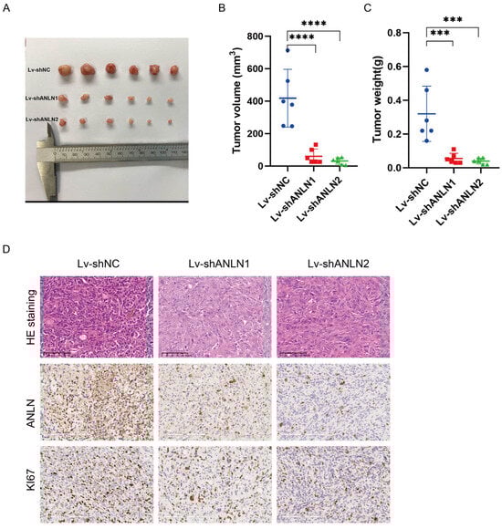 Building upon the findings from the cell experiments, we conducted further investigations into the role of ANLN in an in vivo setting. We designed shRNA targeting ANLN and verified its knockdown effect in the GBC-SD cell line. Subsequently, stable GBC-SD cells with ANLN silencing and negative control cells were subcutaneously implanted into the armpits of nude mice to establish a subcutaneous tumor transplantation model. The results are shown in Figure 4A, revealing significant inhibition of GBC tumor growth in the nude mouse subcutaneous tumor model following ANLN silencing, as confirmed by the reduced weight and volume of the subcutaneous tumors (Figure 4B,C). Additionally, immunohistochemical analysis demonstrated a decrease in Ki67 levels in the subcutaneous tumor tissues after ANLN silencing compared to the negative control group (Figure 4D). These findings collectively support the role of ANLN in promoting GBC growth in vivo.