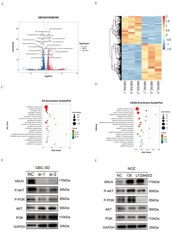 RNA-seq result analysis and protein level detection. (A) Volcano plots of differentially expressed genes (DEGs) after silencing ANLN in GBC-SD cells. (B). Heat map of DEGs. (C,D). Gene Ontology (GO) and Kyoto Encyclopedia of Genes and Genomes (KEGG) analysis of DEGs. (E,F) WB results of ANLN, Phosphorylation Phosphotylinosital 3 kinase (p-PI3K), Phosphatidylinositol 3-kinase (PI3K), phosphorylated AKT protein (p-AKT) and AKT (Serine/Threonine Kinase) expression in GBC cells (LY294002 is a broad-spectrum PI3K inhibitor with PI3K as its target). The uncropped blots are shown in Supplemental Materials.