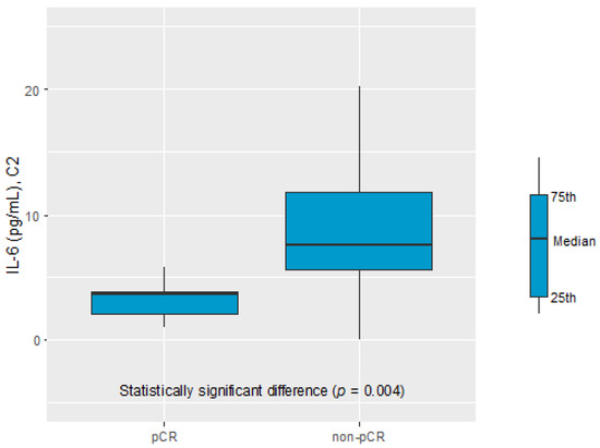 Only the IL-6 serum level was found to be a potential biomarker of the pathological response to NAC. The IL-6 serum level before C2 of chemotherapy was significantly elevated in the non-pCR vs. the complete pathological response (pCR) group (7.63 pg/mL vs. 3.71 pg/mL, p = 0.004), see Figure 1.