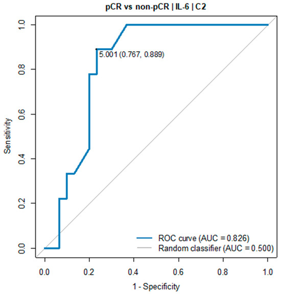 The receiver operating characteristic (ROC) curve showed the predictive power of IL-6. The optimal threshold for diagnosing pCR was 5.0 pg/mL (AUC = 0.826, 95% CI: 0.698–0.954, p = 0.001), see Table 1 and Figure 2.