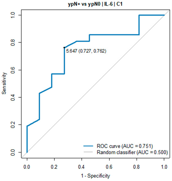 In all patients with an IL-6 serum level below 5.0 pg/mL in C2, tumour regression TRG1a/1b according to the Becker classification was detected in postoperative histopathological specimens. Due to the small sample size, the pCR group was defined as TGR-1a/1b and ypN0. A similar relationship was found in the ypN0 vs. the ypN+ group. The IL-6 serum level before C1 of chemotherapy was significantly elevated in ypN+ vs. ypN0 (7.69 pg/mL vs. 2.89 pg/mL, p = 0.022). The ROC curve showed the predictive power of IL-6. The optimal threshold for diagnosing ypN0 was 5.0 pg/mL (AUC = 0.751, 95% CI: 0.568–0.934, p = 0.017), see Table 2 and Figure 3.