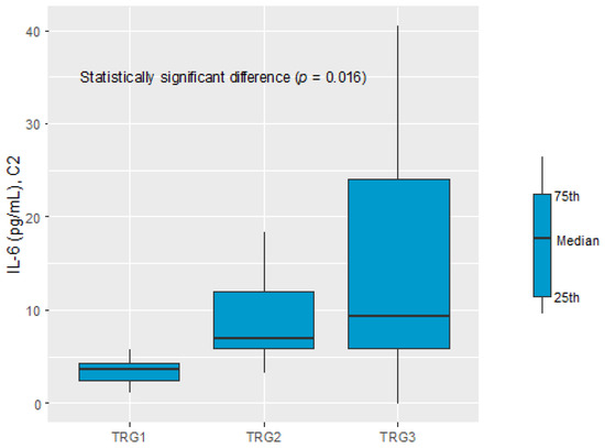 A significant difference in the IL-6 serum level before C2 of chemotherapy was recognised comparing the TGR1, TGR2, and TGR3 groups (3.76 pg/mL vs. 7.07 pg/mL vs. 9.43 pg/mL, respectively, p = 0.016), see Figure 4.