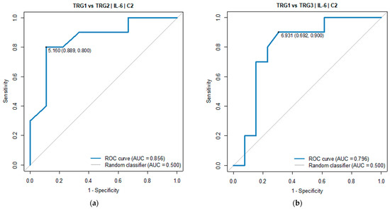 ROC curve for IL-6 (C2) as a diagnostic test between (a) TRG1 and TRG2 groups and between (b) TRG1 and TRG3 groups.