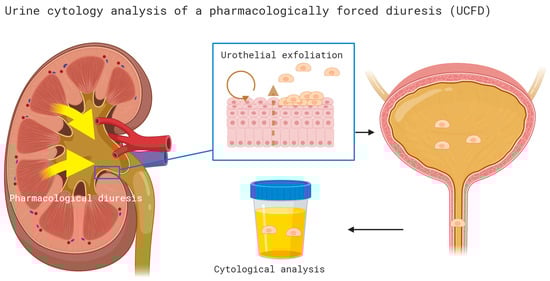 Cytology of pharmacologically forced diuresis was performed by collecting urine after a forced diuresis induced by oral furosemide administration (40 mg) and an oral fluid overload. In an outpatient setting, patients were asked to collect approximately 500 mL of spontaneously voided urine after consuming the diuretic and an oral water intake of 1 L (i.e., forced diuresis). The urine samples were then stored in a fridge (at 4 °C) and processed at the Department of Pathology of the University Hospital Bern within 24 h (see Figure 1).