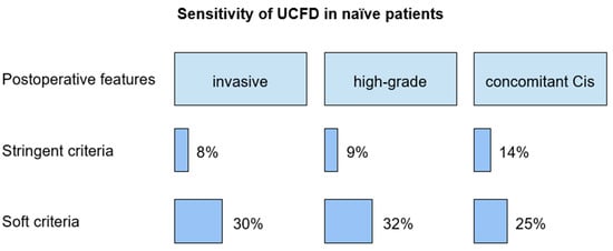According to the soft criterion, sensitivity in patients with invasive upper tract urothelial carcinoma, high-grade and low-grade upper tract urothelial carcinoma, and concomitant carcinoma in situ was 30%, 32%, 50%, and 25%, respectively.