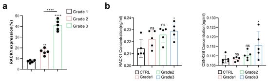 To investigate the correlation between RACK1 expression and the malignancy of meningiomas, we collected tumor tissues from meningiomas of various WHO grades for immunohistochemical and HE staining (Figure S3). Our findings indicate that RACK1 expression levels were higher in meningiomas with a greater degree of malignancy, and that there were significant differences in RACK1 levels among the different WHO grades (Figure 1a). Besides, we found that the levels of RACK1 and CSN2KB in the serum samples of patients with malignant meningiomas (especially WHO grade3) were higher than patients without meningioma (Figure 1b).