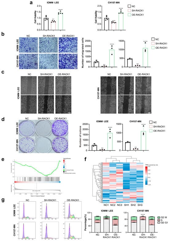RACK1 promotes the proliferation and migration ability of meningioma cells and affects the cell cycle. (a) Cell viability of IOMM-LEE and CH157-MN is detected by CCK-8 assay (** p < 0.01, *** p < 0.001, **** p < 0.0001); (b) Transwell assay of IOMM-LEE and CH157-MN (** p < 0.01, **** p < 0.0001); (c) Scratch assay of IOMM-LEE and CH157-MN; (d) Colony assay of IOMM-LEE and CH157-MN (** p < 0.01, **** p < 0.0001); (e,f) GSEA pathway enrichment analysis of cell cycle pathway; (g) Cell cycle of IOMM-LEE and CH157-MN is detected by flow cytometry (* p < 0.05, ** p < 0.01, *** p < 0.001, **** p < 0.0001).