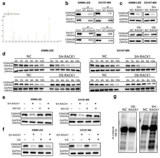 RACK1 inhibits its ubiquitination degradation by binding to CSNK2B. (a) Whole-cell extracts obtained from IOMM-LEE cells were incubated with an anti-RACK1 antibody. The purified protein was subjected to analysis using LC-MS/MS; (b) Western blot was conducted on the whole-cell lysates (input), Co-IP complexes captured using anti-CSNK2B antibody and anti-CSNK2B antibody in both IOMM-LEE and CH157-MN cells; (c) Western blot of IOMM-LEE and CH157-MN lysates whose RACK1 were knocked down or overexpressed; (d) Western blot of IOMM-LEE and CH157-MN lysates which were used with cycloheximide (CHX) to inhibit protein synthesis; (e) Western blot of IOMM-LEE and CH157-MN lysates which were used with MG132; (f) Western blot of IOMM-LEE and CH157-MN lysates which were used with CQ; (g) Western blot of Co-IP complex captured with anti-CSNK2B antibody in IOMM-LEE cells to detect the ubiquitin levels.