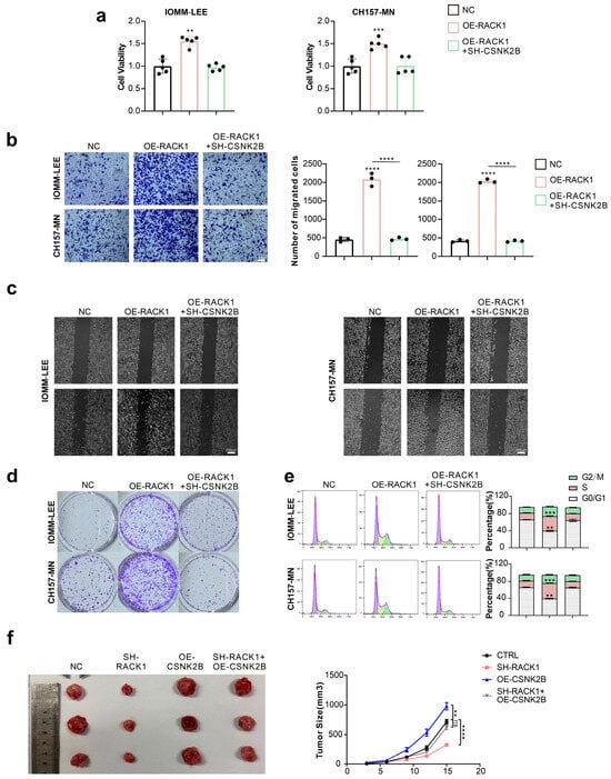 To investigate the effect of CSNK2B on the behavior of meningioma cells, we altered the expression of RACK1 and CSNK2B in IOMM-LEE and CH157-MN cells. We assessed the changes in cell viability as well as proliferation and migration ability by CCK-8 assay, colony formation assay, Transwell assay, and scratch assay (Figure 4a–d). The knockdown of CSNK2B counteracted the enhanced effects of RACK1 overexpression on cell viability, proliferation, and migration. Furthermore, flow cytometry revealed that CSNK2B knockdown attenuated the effects of RACK1 overexpression on the meningioma cell cycle (Figure 4e). Additionally, the subcutaneous implantation of tumors in nude mice showed that, compared to the control group, meningioma cells with RACK1 knockdown formed smaller tumors, while those overexpressing CSNK2B developed larger tumors. However, cells with both RACK1-KO and CSNK2B-OE formed tumors with sizes not significantly different from the control group (Figure 4f).