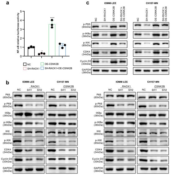 First, we performed KEGG pathway enrichment of the proteins interacting with RACK1 and found that the NF-κB pathway had the smallest p-value (p = 0.0025), so we inferred that the NF-κB pathway may be closely linked to RACK1-CSNK2B. The results of KEGG enrichment are displayed in the Supplementary Material (Table S2, Figure S4). Besides, in previous studies, CSNK2B has been shown to affect tumor progression by activating the NF-κB pathway [28,29]. Therefore, we evaluated the effect of RACK1 and CSNK2B expression levels on NF-κB transcriptional activity using a dual luciferase assay. The results showed that the knockdown of RACK1 significantly decreased the NF-κB transcriptional activity, whereas the overexpression of CSNK2B resulted in a significant increase. However, the simultaneous knockdown of RACK1 and the overexpression of CSNK2B resulted in no significant change in NF-κB transcriptional activity compared to the control group (Figure 5a). Transcriptome sequencing data analysis revealed that RACK1 knockdown significantly downregulated the cell cycle pathway in meningioma cells, with CDK4 and cyclin D3 being the most affected. Therefore, we assessed the effects of RACK1 and CSNK2B on the NF-κB pathway and CDK4 and cyclin D3 expression levels by western blot. We observed that the knockdown of both RACK1 and CSNK2B downregulated the protein levels of p-p65, p-IκBα, p-IKK, CDK4, and cyclin D3 (Figure 5b). On the other hand, the overexpression of CSNK2B, following the knockdown of RACK1, counteracted the downregulation of p-p65, p-IκBα, p-IKK, CDK4, and cyclin D3 caused by the knockdown of RACK1 (Figure 5c).
