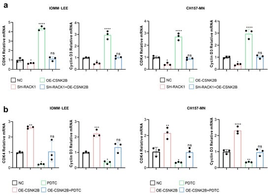 Furthermore, we explored the effects of RACK1 and CSNK2B on CDK4 and cyclin D3 mRNA levels using qPCR. Our findings showed that the knockdown of RACK1 down-regulated CDK4 and cyclin D3 mRNA levels. However, the overexpression of CSNK2B, following RACK1 knockdown, reversed the downregulation of CDK4 and cyclin D3 mRNA levels (Figure 6a). Additionally, we discovered that the NF-κB inhibitor PDTC counteracted the stimulatory effect of CSNK2B overexpression on CDK4 and cyclin D3 mRNA expression (Figure 6b).