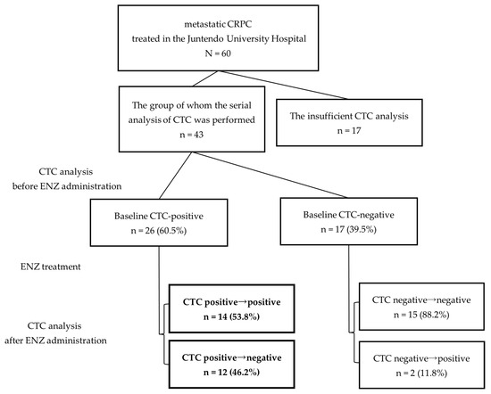Flowchart of the analysis. CTC samples were collected from 46 patients at the time of ENZ administration and after starting ENZ treatment. The boxes indicate the number of patients who remained CTC positive, and those who experienced negative reversion are indicated in the box. CRPC, castration-resistant prostate cancer; CTC, circulating tumor cell; ENZ, enzalutamide.