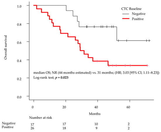 The observation period was from ENZ administration until death or the end of the study period, with an overall average observation period of 37 months (range 5–73 months). During the final observation period of this study, stratified analysis based on baseline CTC positivity revealed a median observation period of 31 months (range: 5–72) for the CTC-positive group and 44 months (range: 21–73) for the CTC-negative group. In the Kaplan–Meier curve analyzed by the log-rank test, the baseline CTC-negative group had significantly longer OS than the baseline CTC-positive group (median OS: not reached (NR) (44 months estimated) vs. 31 months; (HR, 3.03 [95% CI; 1.11–8.23]; p = 0.023; Figure 2). The mortality events for overall survival rates stratified by baseline CTC negativity/positivity were as follows: In the entire cohort, there were 22 deaths out of 43 cases (51%). Within the CTC-positive group, the mortality events were 17 out of 26 cases (65%), while in the baseline CTC-negative group, the events were 5 out of 17 cases (29%). The number of CTC-positive patients at baseline was 60.5% (26/43) of cases (Figure 1, Table 1), while 46.2% of patients showed “negative reversion” of CTCs during treatment with ENZ (12/26). In addition, 53.8% (14/26) of CTC-positive patients remained as such during ENZ treatment. Only two cases converted from negative to positive despite ENZ treatment. Regarding the presence or absence of AR-V7 at baseline, AR-V7 was positive in 4/14 cases in the continuous CTC positive group and in 0/12 cases in the CTC negative conversion group.