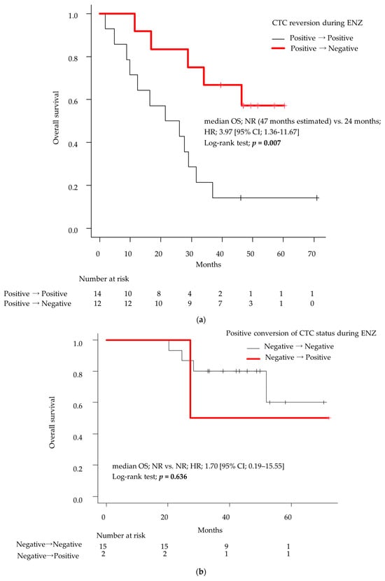 In the Kaplan–Meier curve of patients with baseline CTC-positive analyzed by the log-rank test, the group that achieved negative reversion of CTCs during treatment with ENZ had significantly prolonged OS compared to the group that remained CTC-positive (median OS: not reached (47 months estimated) vs. 24 months; HR: 3.97 [95% CI; 1.36–11.67]; p = 0.007; Figure 3a). In this study, although the group whose CTC was negative at baseline and remained negative during the observation period also did not reach the median OS during the observation period (Figure 3b), this group and the patients who achieved negative reversion from positive CTC to negative found no statistically significant difference in OS. In contrast, only two cases showed positive conversion of CTC status from baseline negative to positive during ENZ treatment. One patient was alive during the observation period, and one patient died of cancer (27 months later).