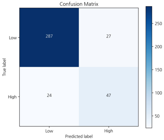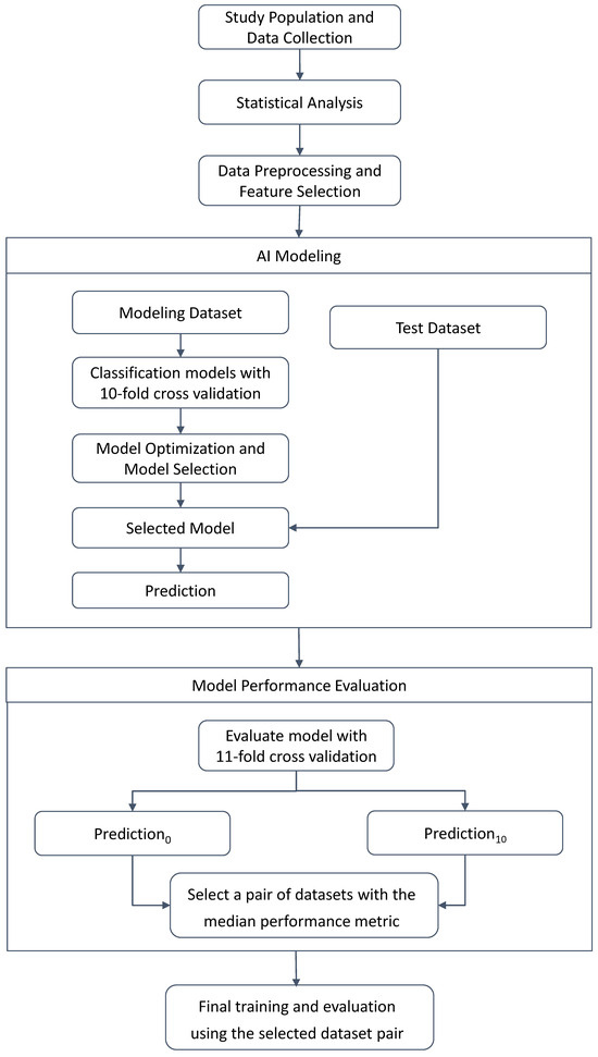 Additionally, the ensemble model combining MMP and ODX utilized CatBoost and XGBoost through soft voting. To address the class imbalance problem between ‘low’ and ‘high’ risk categories, the F1 score was incorporated into the performance metrics for model evaluation, in addition to accuracy. For the final model training, the entire modeling dataset, which includes the combined validation set, was utilized. During the model validation stage, we set the ‘low risk’ as a ‘positive’ class and evaluated the overall performance on 11 randomly selected modeling–test dataset pairs. Following this assessment, we chose the final modeling–test dataset pair by selecting the one with the median of the performance metrics across all evaluated dataset pairs. This approach ensured that the selected pair represented a balanced and representative performance assessment, contributing to the robustness of our model evaluation process.