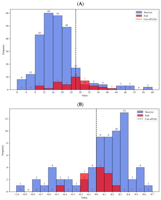 Distribution of MGA scores. (A) In the MMP cohort (n = 526), 36.3% of patients (n = 191) were classified as high risk (MMP index < 0). (B) In the ODX cohort (n = 2039), 14.3% of patients (n = 297) were classified as high risk (ODX risk score > 25). MGA, multi-gene assay; MMP, Mammaprint; ODX, Oncotype DX.