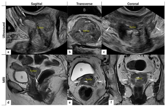 Three imaging planes of three-dimensional (3D) ultrasound and MRI. Cervical squamous cell carcinoma in a 57-year-old woman with FIGO stage IIIC1 (T2b N1 M0). Sagittal (a), transverse (b), and coronal plane (c) on 3D ultrasound depict a large tumour of 5 cm (max diameter) as a hypoechogenic mass. T2-weighted MRI images in sagittal (d), transverse (e), and coronal (f) planes visualise the tumour as a slightly hyperintense cervical mass. Both imaging methods showed in the sagittal view an infiltration of the ventral vaginal wall (V) and in the transverse and coronal plane a bilateral invasion of lateral parametria (P) marked with arrows and single letters of corresponding adjacent soft tissue infiltration. B, bladder; MRI, magnetic resonance imaging; V, vagina.