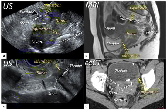 The last step in local staging focuses on the assessment of tumour growth into the adjacent organs (bladder and rectum or sigmoid colon). The level of infiltration of both the bladder and rectum can be determined simultaneously using an identical grading system (see below) [45]. Ultrasound or MRI are used to detect the infiltration of the endopelvic fascia based on the assessment of the contact planes between adjacent organs and the extent of involvement of both the bladder and rectal wall (Figure 6 and Figure 7) [45,52].