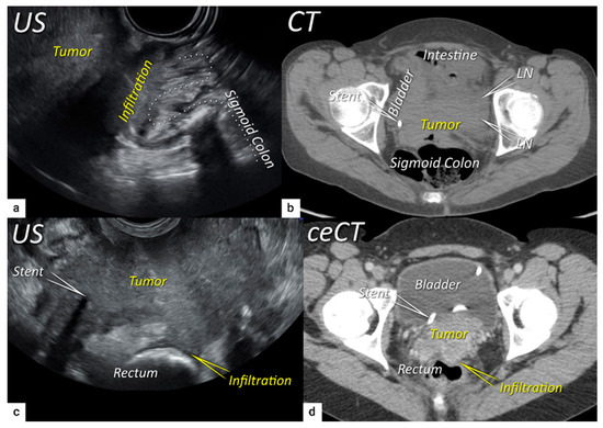 Infiltration of the rectosigmoid wall. Upper row: Sagittal transrectal ultrasound depicting a large squamous cell cervical carcinoma with a maximum diameter of 94 mm (T3bN1M0/FIGO stage IIIC1) in a 65-year-old woman (same patient as Figure 5), infiltrating the rectosigmoid colon with retraction of loops towards the tumour (a). Axial non-contrast computed tomography (CT) (b) shows a tumour infiltrating the muscle wall of the sigmoid colon and bladder and the pelvic side wall bilaterally with bulky lymph nodes in the left obturator fossa (LN). The right ureter with a stent is embedded within the right lateral pelvic side wall invasion. Lower row: A 38-year-old patient with maximum diameter 48 mm (T4N1M0/FIGO stage IVA) (same patient as in Figure 6) with squamous cell carcinoma depicted in the transverse plane by transrectal ultrasound (c) showing infiltration of the muscle layer of the rectum from the left uterosacral ligament and bilateral pelvic side wall infiltration with a visible right ureteral stent within the pelvic side wall infiltration. The transverse plane of contrast-enhanced computed tomography (CT) (d) demonstrates rectal wall infiltration and ureteral stent laterally. US, ultrasound; MRI, magnetic resonance imaging; ceCT, contrast-enhanced computed tomography.