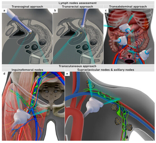 On ultrasound, the combination of endoluminal (transvaginal/transrectal approach), convex (transabdominal approach) and linear array probes (transcutaneous approach) are used to detect regional (pelvic [parailiac] and abdominal [paraaortic]) and distant nodal involvement (supraclavicular, inguinal, axillar and others) (Figure 8).
