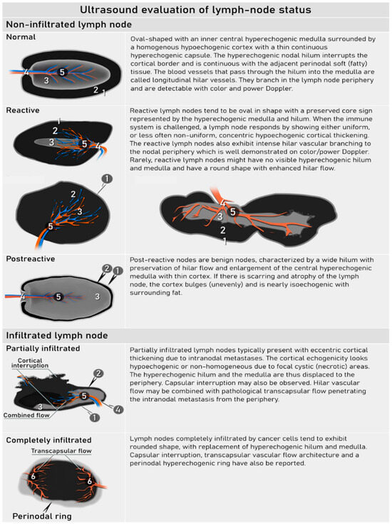 Ultrasound features of normal, reactive and infiltrated lymph nodes.