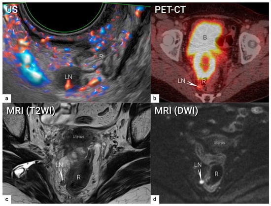 Similarly to ultrasound, CT and MRI traditionally evaluate lymph nodes based on their size and morphological criteria. Metastatic lymph nodes often show a round shape, irregular margins, inhomogeneity, loss of fatty hilum, and a tendency to increase enhancement after intravenous contrast administration. Recently, it has been shown that using DWI depicting restricted diffusion in metastatic lymph nodes is helpful for detecting lymph node metastases (Figure 10) [78]. Since it is not exposed to radiation, DWI/MRI is clearly preferred in the staging of pregnant women with cervical cancer [79]. An advantage of PET-CT is the fusion of anatomical information provided by CT and metabolic information provided by PET [80]. FDG PET-CT can detect metastatic spread even in normal-sized nodes by demonstrating high tumour-related metabolic activity (Figure 10). The ability of FDG PET-CT to correctly identify metastatic lymph nodes is, however, largely affected by lymph node size, with node-based reported sensitivities of 100%, 67%, and 13% in metastatic nodes ≥ 10 mm, 5–9 mm, and ≤4 mm, respectively, in uterine cancers [81]. PET-CT may also play an important role in the correct identification of lymph nodes enlarged due to benign reasons. Novel imaging techniques such as FDG (fluorodeoxyglucose)- hybrid PET-MRI integrates high-resolution multi-planar morphologic and functional information from MRI with the metabolic data from FDG PET simultaneously (Figure 11). As opposed to CT, MRI yields superior soft tissue contrast and relatively high spatial resolution and imposes no ionising radiation, while PET offers high sensitivity for metabolic alterations due to the detection of a high metabolism, which seems to be useful for differentiating between metastatic and benign lymph nodes and may reduce false findings [82]. Recent data suggest that FDG PET-MRI is equivalent to MRI and superior to FDG PET-CT for local staging of the primary tumour, and FDG PET-MRI is comparable to FDG PET-CT for nodal staging [43,83]. PET-MRI is more expensive than PET-CT as it combines the cost of a full MRI with a full PET scanner and requires the increased imaging times of MRI compared to CT. However, in patients who require both MRI and PET, the overall scanning time will be reduced with improved localisation of the PET signal. Fused images from PET-MRI might improve the staging results, which will need to be evaluated in a large, multicentric, prospective study.