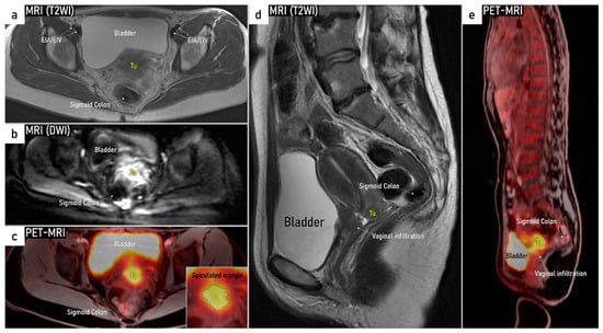 PET-MRI imaging of uterine cervix carcinoma. A 40-year-old woman (T2bN0M0/FIGO stage IIB) having a squamous cell cervical carcinoma with lateral parametrial infiltration bilaterally and infiltration of the upper third of the vagina. The rectum and urinary bladder are intact. No pathologic lymph nodes are seen in the pelvis or at other localisation. The axial T2W imaging (MRI) (a), diffusion-weighted imaging (DWI; high b-value image) (b) and fluorodeoxyglucose (FDG)-positron emission tomography (PET)-MRI (c) depicting cervical carcinoma (tumour) with spiculated margins bilaterally infiltrating the parametria (arrows). The tumour exhibits diffusion restriction with hyperintensity on the high b-value image (DWI) and high FDG-avidity depicted by PET-MRI. The sagittal T2W image (d) and PET-MRI (e) depict the tumour as hypermetabolic (PET-CT) and hyperintense (T2W image) and affecting both the endo- and exocervix (tumour) and infiltrating the upper third of the vagina (arrow).