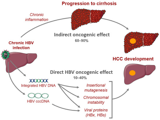 Hepatitis B virus (HBV) is a global public health problem with an estimated 350 million chronic hepatitis B carriers, causing 820,000 deaths in 2019 alone [1,2,3]. HBV is endemic in many parts of the world, including Southeast Asia, China, and Africa [4]. It belongs to a family of DNA viruses called hepadnaviruses, which is composed of at least ten genotypes, A–J [2,5,6]. The virion is an enveloped nucleocapsid that delivers an incomplete circular DNA genome into the host cell, initiating viral replication [7]. HBV is a dynamic, hepatotropic virus and its infection has a wide spectrum of clinical manifestations [7]. Fifteen–forty percent of HBV-infected patients develop cirrhosis, liver failure, or hepatocellular carcinoma (HCC) [1,8]. In fact, HBV is the most common hepatocarcinogen, being accountable for 25% of HCC cases in developed countries and 60% in developing countries [9,10,11,12]. There is a limited understanding of the pathogenesis, prognosis, and treatment strategies for HBV-associated HCC, which we highlight in this review paper.