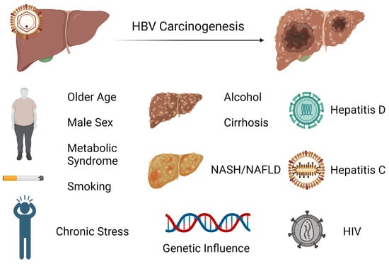 HCC is one of the major malignant diseases in the world today and ranks fifth in overall frequency. Its incidence is high in Eastern Asia and sub-Saharan Africa and is increasing in many parts of the Western world [46]. Among cancers, the annual mortality from HCC is relatively high because of its rapid progression and poor prognosis. Unfortunately, the diagnosis is typically made later in its course when therapeutic interventions are generally ineffective. Thus, the focus has been on early screening and treatment of known causes, including chronic hepatitis B which is the most frequent underlying cause of HCC. There are several major risk factors for development of HCC in chronic HBV infection. While having a first-degree relative with HCC, metabolic syndrome, type 2 diabetes, and central obesity are all host factors that have been linked to HCC development in HBV-infected patients or carriers, it appears that liver cirrhosis has been consistently identified to be the most significant risk factor for development of HCC during nucleos(t)ide therapy [47,48,49,50,51]. Notably, there is increasing evidence that non-alcoholic fatty liver disease (NAFLD) is becoming one of the largest causes of HCC, particularly in industrialized countries [52]. In these patients, HCC can develop even in the absence of cirrhosis. As there are no specific pharmacological therapies for NAFLD, adoption of healthy lifestyle changes including weight loss and regular aerobic physical activity remain the mainstay treatment. Interestingly, bariatric surgery is known to provide durable weight loss and has been identified to be associated with a decreased risk of HCC. A meta-analysis involving nearly 20 million patients showed that bariatric surgery has a protective effect on risk of HCC occurrence and incidence compared to those subjects who did not undergo the procedure [53]. Studies indicate that the presence of male gender, increasing age, higher HBV DNA level, and core promoter mutations are also independently associated with HCC risk [54,55]. It is postulated that androgens may play a role in the observed difference in incidence of HCC based on gender [56]. Among patients with chronic hepatitis B infection treated with nucleos(t)ide therapy, those with hepatitis D coinfection have been shown to have a nearly sixfold risk of HCC development compared to patients without hepatitis D coinfection [57]. While less investigated, concurrent HCV or HIV infection has also been identified to have an association with increased incidence of HCC [58,59]. The risk factors for hepatocarcinogenesis can be seen in Figure 2.