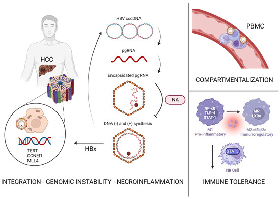It has been discovered that HBV’s covalently closed circular DNA (cccDNA) integrates into the hepatocytes upon initial infection and can be detected even after antiviral treatment. This integration may occur at critical HCC driver genes which may give rise to malignant HBV-infected hepatocytes. Li et al. found that the common location of integration included the TERT, CCNEI1, and MLL4 genes, and that virus–host chimera DNA circulate in 97.7% of CHB patients with HCC [89,90]. Interestingly, the group demonstrated how virus–host chimera DNA could be used as a biomarker for detecting tumor load in this patient population, and how it may aid in monitoring recurrence after tumor resection [89]. In the first detailed molecular evaluation completed by Coffin et al., despite undetectable HBV DNA in plasma via clinical assays, patients treated with oral anti-HBV therapy undergoing liver transplant were found to have low levels of HBV genome in the liver, circulating lymphoid cells, as well as plasma using ultrasensitive PCR/nucleic acid hybridization assay. Their data promote the idea of HBV compartmentalization, where despite adequate suppression, the liver supports replication and extrahepatic HBV can be detected, particularly in peripheral blood mononuclear cells (PBMCs) that may serve as a sanctuary for wild-type viruses during antiviral therapy [91].