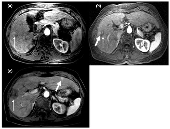 Axial fat-suppressed, T1-weighted postcontrast images of (a) the initial mass concerning for HCC (arrow), (b) post-TACE lesion (thin arrow) with adjacent focal hyperenhancement (thick arrow), and (c) post-TACE and RFA lesion in segment 5 (thin arrow) with new hyper-enhancing lesion in segment 3 (thick arrow). Sourced from Chowdhury et al. [109].