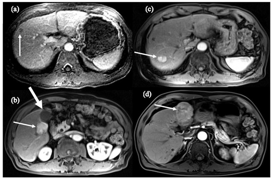 Axial fat-suppressed, T1-weighted postcontrast images of (a) the initial segment 8 mass concerning for HCC (arrow), (b) post-RFA and NA therapy 3 cm segment 5 hyper-enhancing HCC (thin arrow) adjacent to gallbladder (thick arrow), (c) second hyper-enhancing segment 7 HCC (arrow), and (d) post-cholecystectomy and tumor ablation large segment 4 HCC (arrow). Sourced from Chowdhury et al. [109].