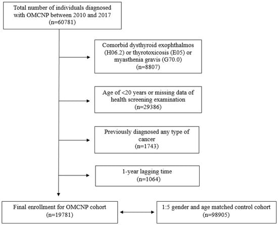 This study included individuals aged ≥20 years with newly diagnosed OMCNP based on the ICD-10-CM codes between 2010 and 2017, who underwent a national health screening examination within 2 years prior to the diagnosis of OMCNP. Those with ICD-10-CM codes of H49.0 (third cranial nerve palsy), H49.1 (fourth cranial nerve palsy), and H49.2 (sixth cranial nerve palsy) were enrolled. We excluded anyone with myasthenia gravis (G70.0), dysthyroid exophthalmos (H06.2), or thyrotoxicosis (E05). Those with a history of any type of cancer at any time before enrollment were also excluded. The control cohort was selected by a 1:5 propensity score matching based on gender and age of individuals not diagnosed with OMCNP (19,781 individuals with OMCNP and 98,905 controls). The primary end point was the incidence of newly diagnosed primary malignant brain tumors. Primary malignant brain tumor was defined as a malignant neoplasm of the meninges (C70), brain (C71), spine or other central nervous systems (C72), along with a special claim for cancer (V193). We excluded benign brain tumors due to different clinical behavior and growth patterns, including mortality and morbidity between malignant and nonmalignant tumors [4,13,20]. Metastatic brain tumors were also excluded because of their different etiologies and histological variance depending on the origin of the primary tumor.