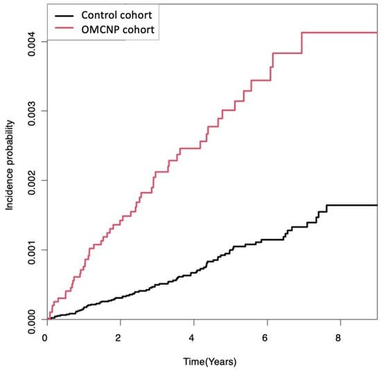 Cumulative incidence of primary malignant brain tumors in the OMCNP cohort and control cohort are shown in Figure 2. Primary malignant brain tumors occurred more frequently in the OMCNP cohort than in the control cohort during a follow-up period up to 9 years (log-rank p < 0.0001).