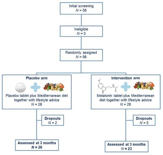 Therefore, the aim of the present 3-month randomized, placebo-controlled trial was to evaluate whether adherence to the MD along with melatonin supplementation or adherence to the MD with placebo would ameliorate CRF in BC patients receiving chemotherapy treatment.