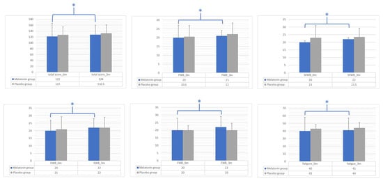 Intra-group and inter-group differences between the melatonin and placebo groups for FACIT-F total score and subscale scores (i.e., PWB, SFWB, EWB, FWB, fatigue). Bar graphs show the median values and interquartile ranges for tested variables at baseline (0 m) and 3 months (3 m) in the melatonin group (blue bars) and the placebo group (gray bars). Differences between the two groups at the trial endpoint were assessed by the Mann–Whitney U test. Differences inside a group before and after the intervention were assessed by the Wilcoxon signed-rank test. * p-value: significant differences between baseline and follow-up (3 months) analyzed by the Wilcoxon signed-rank test; statistical significance was set at p-value < 0.05. FACIT-F, Functional Assessment of Chronic Illness Therapy—Fatigue; PBW, physical well-being; SFWB, social/family well-being; EWB, emotional well-being; FWB, functional well-being.