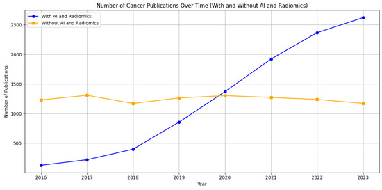 Comparative trends in cancer research publications from 2016 to 2023 on PubMed. The graph shows a marked increase in publications incorporating artificial intelligence and radiomics (blue line), contrasting with a relatively steady count of publications in broader cancer research (orange line). This illustrates the burgeoning role of advanced computational methods in cancer-related studies.