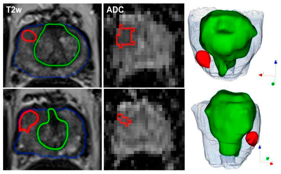 Representative segmentation of a patient on axial T2-weighted and ADC-images with an initial prostate-specific antigen level of 12.9 ng/ml, normal DRE result, and a highly suspicious lesion located medio-apically in the right peripheral zone (PI-RADS category 4). Targeted MRI/ultrasound-fusion biopsy confirmed the presence of PCa, Gleason 3+4, ISUP 2. The contours outline the following manual segmentations: blue—whole organ, green—transition zone, red—index lesion.